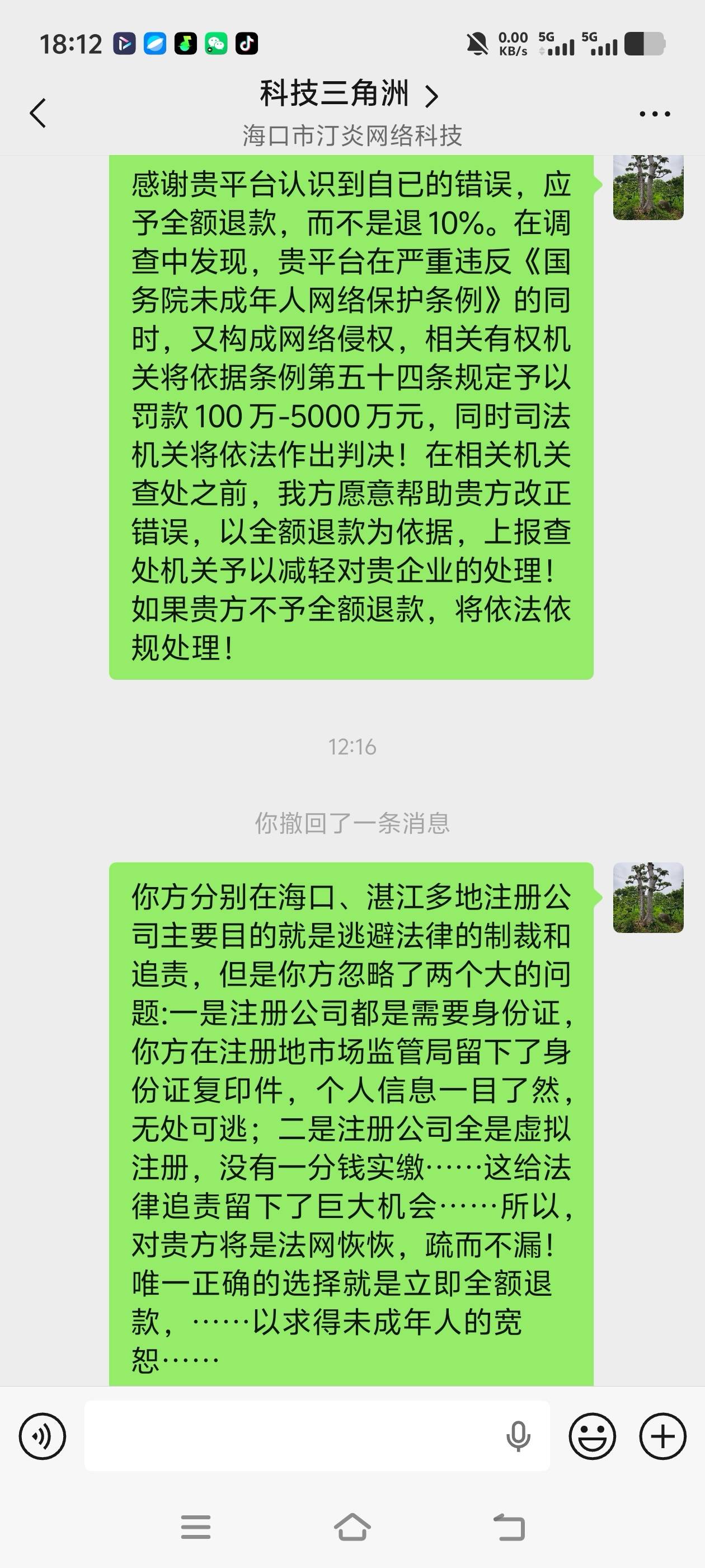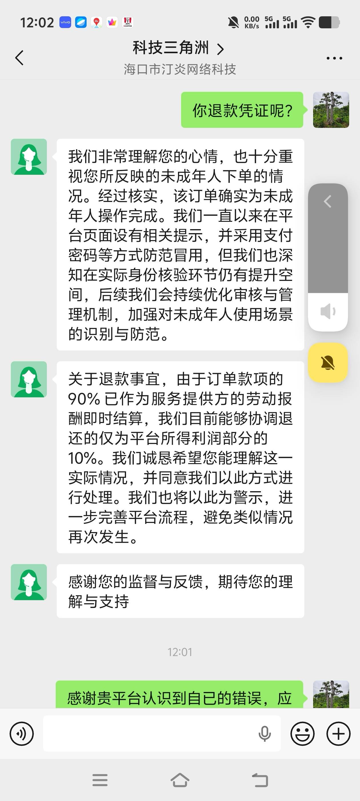 三、该未成年人法定监护人父亲发现孩子被网络侵财后,请求全额退款,海口市汀炎网络科技有限公司虽然在网上交流中表示同意退款,但是,不断寻找借口实际上分文未退。