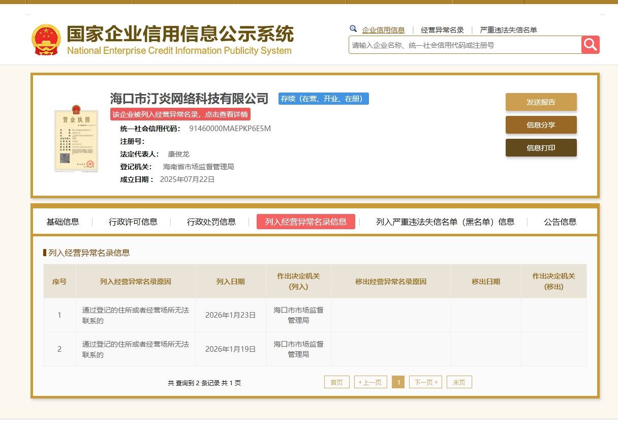 海口市汀炎网络科技有限公司被列为经营异常名录