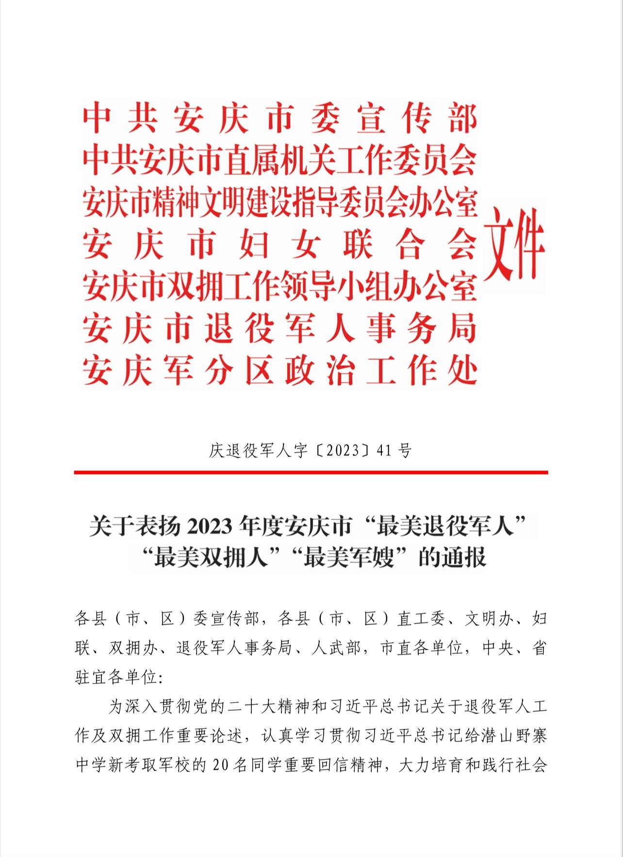 中共安庆市委宣传部等七部门联合评定 "安庆市最美退役军人”的通报